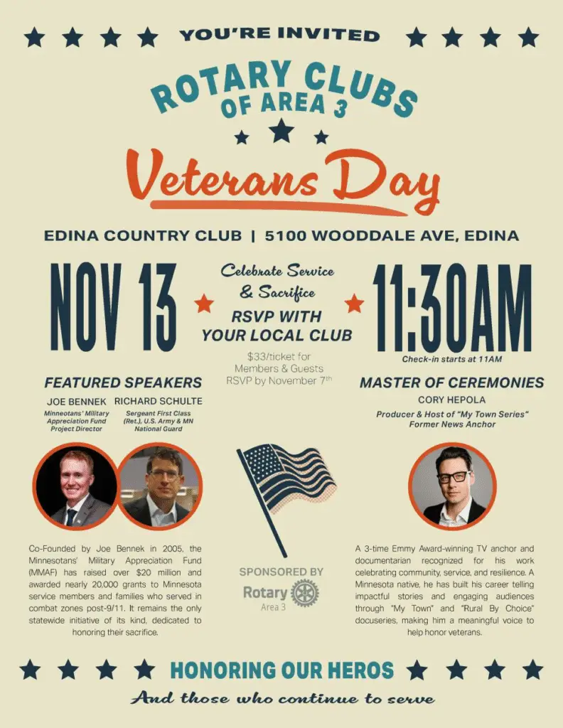 Calendar…“Veterans Day Luncheon—November 13” Invite a Veteran as Your Guest. $33.00 per ticket, Edina Country Club