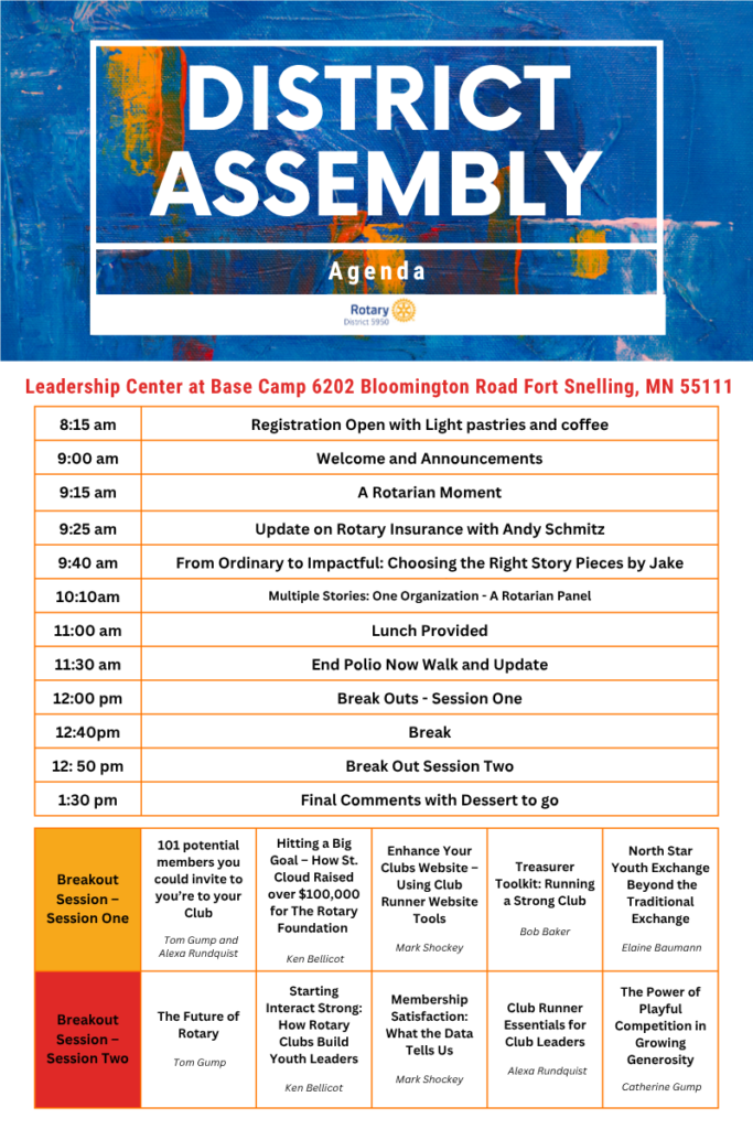 Join your Fellow District 5950 Rotarians for the District Assembly—your annual boost of leadership energy, inspiration, and practical know-how. The program brings together Rotarians from across District 5950 for an engaging day of stories, strategies, and real‑world takeaways to help you thrive in your club leadership role. All Rotarians are encouraged to attend, with a special emphasis on current and incoming Club Presidents, Presidents‑Elect, committee chairs, and anyone stepping into a leadership position. With ten breakout sessions offered during two sessions, we strongly encourage each club to send at least five participants, so no insight, tool, or opportunity is missed. Come ready to learn, connect, and strengthen your ability to lead. This event is no cost for attendees. This event is limited to 150 attendees.